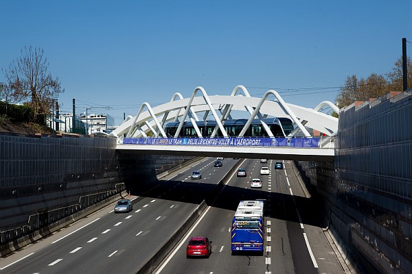 La solution retenue a été de construire un viaduc d’un seul tenant, avec une travée unique dédiée à la plateforme du tramway.